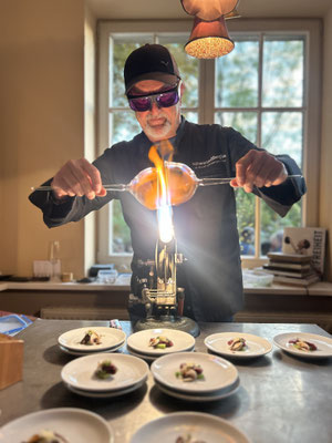 ... seine cloche bläst er live & sie gart bei 1200 grad meine tapas in sekunden !!!! heute ( freitag ) probelauf gemacht ... sensationell ... rochenflügel ... iberico ... schokokuchen ... lachs ... pulpo ... in verschiedenen variationen ... salsas ... wachtel eier ... yemas de huevos ... hierbas ... dips ... jeder darf sich etwas wúnschen ... dazu viele getränke, eine feine location, bestes wetter & freude pur ...